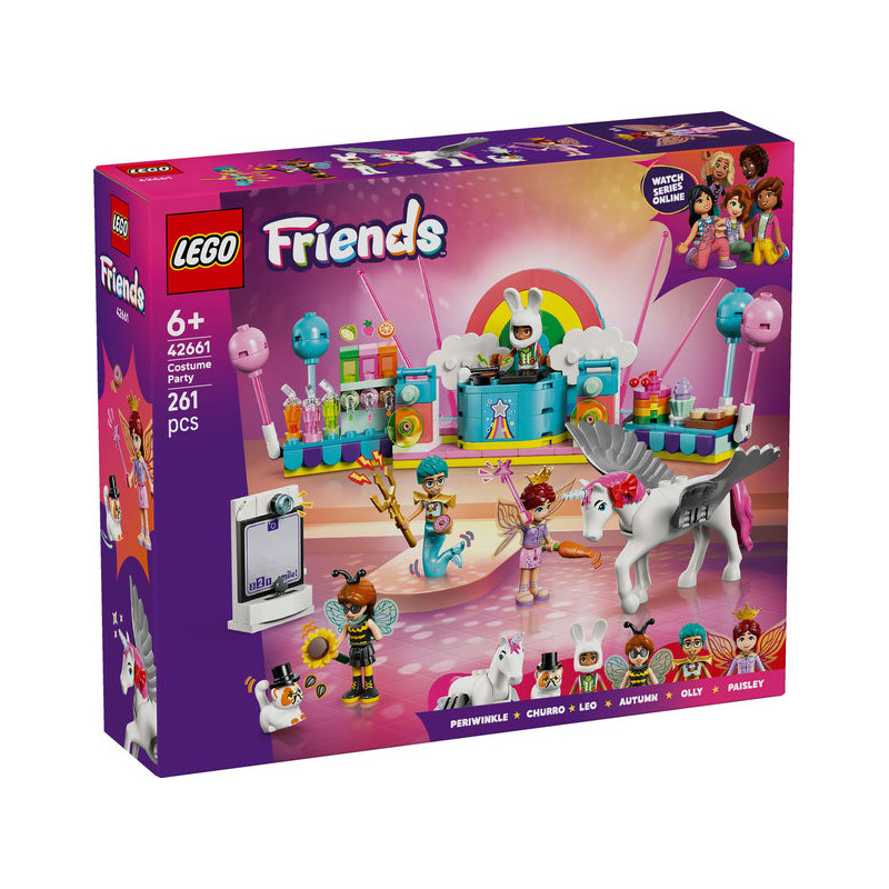 Here’s a kids’ building kit packed with storytelling inspiration. The LEGO® Friends Costume Party with Unicorn & Fairy (42661) set for girls and boys aged 6 and over comes with 4 LEGO Friends minidolls, a cat figure and a horse figure. It also features lots of cute party accessories for pretend play. Kids can create their own fun stories and act out social situations as the friends try on their costumes. Autumn is dressing as a bumblebee and Olly is a merman. Churro the cat joins in the fun in a magician costume with Leo as his white bunny. Paisley wears a fairy costume and Periwinkle the horse transforms into a unicorn. The friends enjoy a party with a stage, DJ booth and snacks. There’s also a photo booth with fun accessories where the friends can pose for pictures. Discover more friendship toys and gifts (sold separately) in the LEGO Friends universe. This set comes with the LEGO Builder app for intuitive building. Here kids can zoom in, rotate models and track progress as they build.