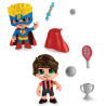 Compatible with the other Action Heroes characters and playsets (sold separately). Sportsman comes with Football, Trophy and Tennis Racket and Super Hero comes with a cape, Lightening Bolt Wand and Cosmic Ball.