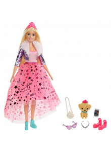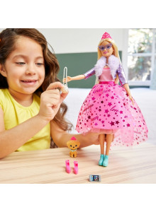 Barbie doll is royally trendy in a pink top and high-low skirt with sweet, sparkly graphics reading, ’believe,’ ‘happy,’ ‘dream,’ and more. A metallic, ‘fur’-lined jacket helps her shine, and blue high- tops add another bright pop of colour. Stylish accessories turn any Barbie story into a fashion fairytale, and no royal adventure would be complete without a pet -- Barbie doll's puppy is super-cute in her own tiara and necklace! With dolls inspired by Barbie Princess Adventure, young minds can follow Barbie and her friends as they embark on a journey of royal proportions.