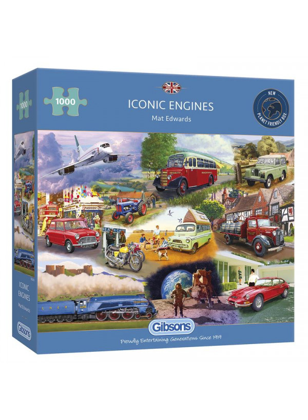 By land, by sea and by air. This stunning puzzle depicts some of the most iconic engines of our time including the LNER Class A4 4498 Sir Nigel Gresley steam train, British Airways Concorde and a Fordson Major tractor working the land.