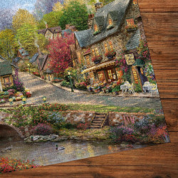 • 🧩 SUMMER IN COBBLESTONE VILLAGE: is the fourth painting in the Bridges of Inspiration collection. Each piece is set in a different season of the year, highlighting the beauty and wonder of Mother Nature. Two tributes to Thomas Kinkade can be found in this painting. The flower shop in the centre of the painting is named after Thom, and the bridge features lamps in the shape of his signature lamp posts.