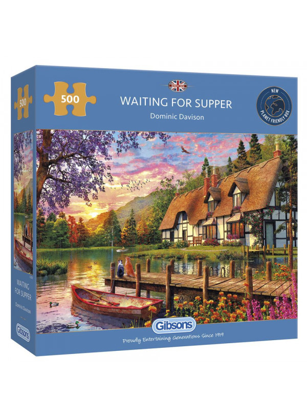 Puzzling is often considered the perfect activity to relax and increase wellbeing. With this 500 piece jigsaw puzzle, the image really does match the activity transporting you into a place of peace and tranquillity. The day is coming to an end and as the sun sets beyond the hills creating a beautiful reflection in the lake below. The dogs wait patiently at the end of the jetty knowing that it won’t be too long before their supper is served.