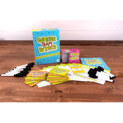 Players will be on one of two teams: Orange Team or Green Team. And then the Green Team wins. Everyone will be asked the same question, then writes down their responses at the same time. All players with the winning answer join the Green Team and score points. But it's not about having the best answer, or the smartest answer, or the funniest answer. Only the most popular answer wins - the one that the most players at the table wrote down. To win, get on the Green Team, stay on the Green Team, and win - because that's what the Green Team does. They win.
