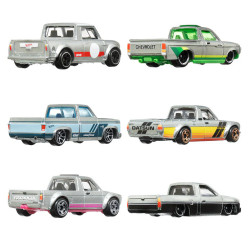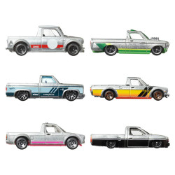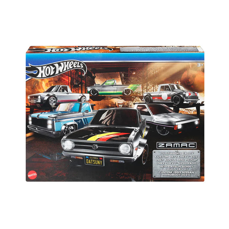 The Hot Wheels ZAMAC Multipack will throw any car collection into high gear with six ZAMAC-themed 1:64 scale toy cars and trucks. This pack contains modern and vintage castings with unpainted bases to celebrate the ZAMAC style. ZAMAC is an acronym for the Zinc, Aluminum, Magnesium, and Copper alloy from which die-cast Hot Wheels are made. Contents: Volkswagen Caddy, Custom 1972 Chevy Luv, 1967 Austin Mini Pickup, 1983 Chevy Silverado, 1975 Datsun Sunny Truck (B1Z0), and a Custom 1993 Nissan Hardbody (DZ1).