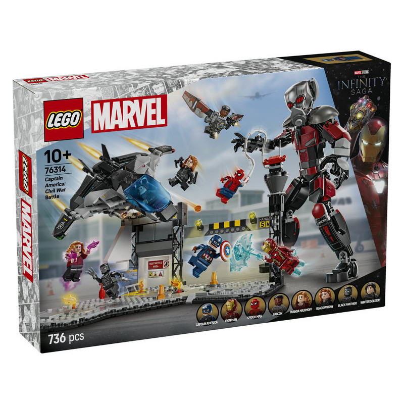 Captain America: Civil War Action Battle (76314) is a detailed, LEGO Marvel building toy that makes an epic Super-Hero gift for 10 plus year old boys and girls. With 9 LEGO Marvel characters, a Quinjet aircraft and lots of accessories, this LEGO set lets kids recreate favourite movie moments and explore endless imaginative adventures or display possibilities of their own. This Marvel building toy is based on the airport battle scene from Marvel Studios’ Captain America: Civil War. It includes 8 LEGO Marvel minifigures – Captain America, Winter Soldier, Wanda, Falcon, Iron Man, Spider-Man, Black Widow and Black Panther – with weapons and accessories, plus a fully jointed LEGO Marvel Ant-Man figure standing over 24 cm (9.5 in.) tall. The Quinjet aircraft features foldable wings and an opening cockpit that seats a minifigure pilot. The battle action is further aided by an exploding barrel feature incorporated within the airport scenery. For added digital fun, builders can zoom in, rotate models in 3D and track their progress using the fun, intuitive LEGO Builder app. This Captain America building toy set makes a great Marvel-themed birthday gift for 10+ year boys and girls. Kids can expand the play possibilities even further by combining this Super-Hero toy with other sets in the LEGO Marvel range (sold separately).
