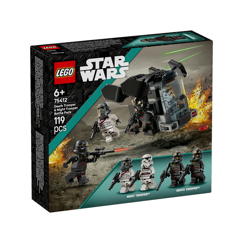 Let kids build their own platoon and transport them into LEGO® Star Wars: Ahsoka™ battles with the Death Trooper & Night Trooper Battle Pack (75412). A cool small gift for boys, girls and any fans aged 6 years old and over, the set includes a dropship building toy with space for 4 LEGO minifigures in the back, 2 stud shooters and a LEGO minifigure cockpit with a removable canopy. The 4 included LEGO Star Wars™ minifigures – 2 Death Troopers and 2 Night Troopers – each have a blaster that can be attached next to them in the back of the dropship, ready for pretend-play battles. Look out for other LEGO Star Wars Battle Pack sets (sold separately) in the range and discover extra LEGO minifigures, vehicles and accessories to give children even more fantasy play possibilities. Contains 119 pieces.