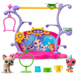 Pets Got Talent Playset: Frenchie (#67) and Bird (#66) are ready for a talent show. This adorable playset features a large stage, a bird perch, a skateboard that slides across a tightrope, and a rotating platform. Your pets can swing, slide, and jump through hoops! Show off their tricks and twirls because there's a trophy too.