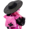 Draculaura wears a glossy pink top with sheer black puff sleeves and a matching skirt. A hat, black stockings and pink booties complete her lurk