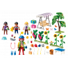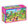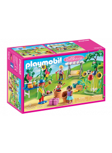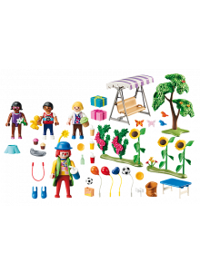Figures: 1 clown, 2 girls, 1 boy Animals: 2 butterflies, 2 birds Accessories: 1 Hollywood swing, 1 table, 4 balloons, 1 balloon holder, 1 bag, 1 skipping rope, 2 bags, 1 football, 1 frisbee, 2 gifts, 1 doll, 3 cupcakes, 1 tray, 4 drink cups, 4 plates, 1 bottle, 1 children's skirt, 1 pair of clown shoes, 1 clown hat with blossom, 1 flower, 1 tree, various garden plants