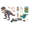 • Cool PLAYMOBIL Dinosaur set featuring a PLAYMOBIL researcher, a Tyrannosaurus Rex, a motorcycle with trailer, a puddle with a footprint, a magnifying glass, camera, map, and additional research equipment.
