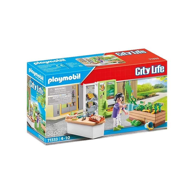 PLAYMOBIL Lunch Kiosk with a PLAYMOBIL figure, counter, fruit, snacks and fillable bottle machine.
