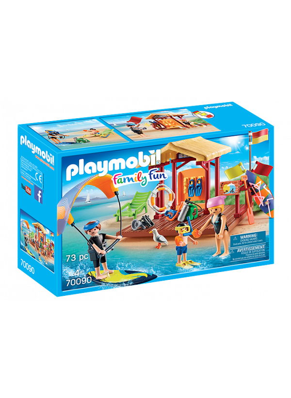 Figures: 1 man, 1 woman, 1 boy Animals: 1 Gull Accessories: 1 water sports school, 1 shelf, 2 boards, 1 kite board with kite bar, 3 different flags, 1 diving bottle with regulator, 2 diving fins, 2 children's fins, 1 diving mask for adults, 1 children's diving mask, 1 diving jacket, 1 paddle, 1 deckchair, 1 life belt, 1 binoculars, 2 water wings, 1 headscarf, 1 peaked cap, 1 megaphone