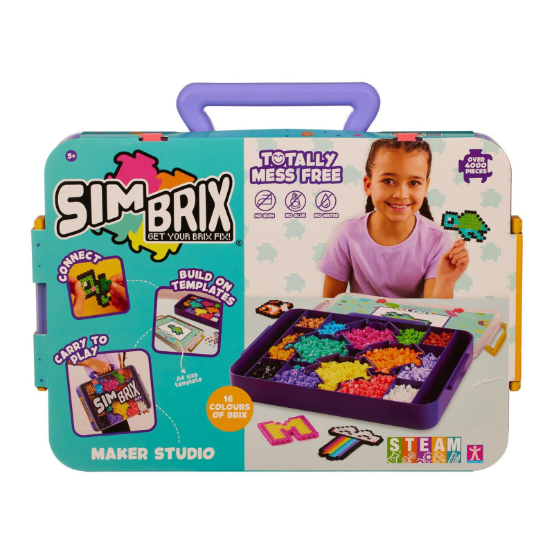 Create unique colourful designs with the all in one Simbrix Maker Studio. The Maker Studio features one tray with sorting compartments for 4000 Simbrix. Includes 16 colours of Simbrix and 30 Simstix. The easy to unclip lid also doubles as a build platform. Follow the templates available in the instructions book or visit the Simbrix website to download full scale templates. Or come up with your very own creations! With the Simbrix Studio the possibilities are endless! The carry handle also means you can easily transport your Simbrix carry case meaning you can take it with you and create Simbrix designs wherever you go!