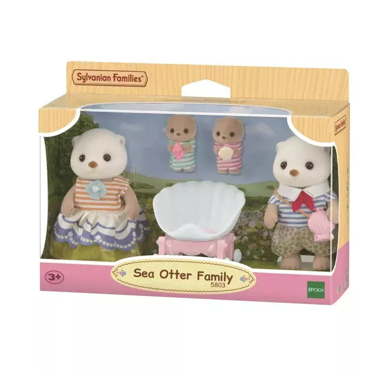 Contents: Sea Otter Father, Sea Otter Mother, Sea Otter Cradled Baby (dressed in green), Sea Otter Cradled Baby (dressed in pink), shell shoulder bag, shell pram.