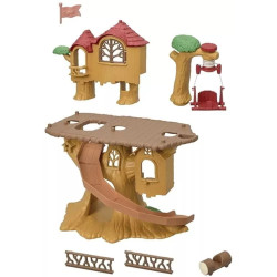 Adventure Tree House's rope swing can go up and down and work as a lift. Place the log ride on the huge slide to make it go down. There are four small rooms. There is a secret passage inside the tree, just for the babies. The hut on the terrace can be removed and played with separately.