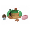 Baby Hedgehog Hideout is a secret hedgehog motif house for a Hedgehog Baby. The Hedgehog Baby fits snugly into the sleeping bag. Inside the hideout is a slide, a hedgehog-shaped table, and a stove.