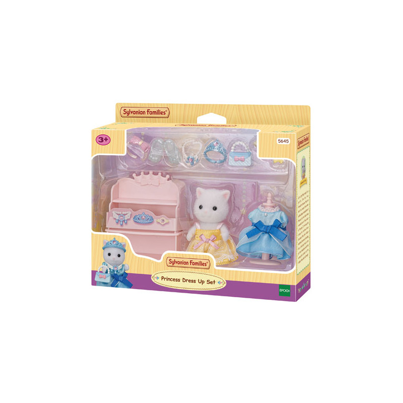 Mix and match dresses, tiara, accessories, and shoes, to give your Sylvanians a princess makeover with this Sylvanian Families Princess Dress Up Set. The Princess Dress Up Set contains Persian Cat girl Lyra, with a lovely yellow dress, a separate blue dress, fashion accessories, and furniture.