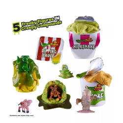 The Terror Fried Ooze Burger meal box includes a fizz-bomb burger and crackle fries. Drop the burger into water for a fizz-fry reveal. Then, crush open the fries and peel open the dipping sauces for more horrible surprises! The Terror Fried Ooze Burger comes in fast-food style carton and includes a collector sheet. Unpack 4 different compounds (burger, fries and two types of slime) to discover 3 freaky figures.