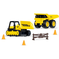 Tonka Mini Classics 2-Pack (Metal Movers Dump Truck and Bulldozer with 3 Traffic Cones and Barrier Fence